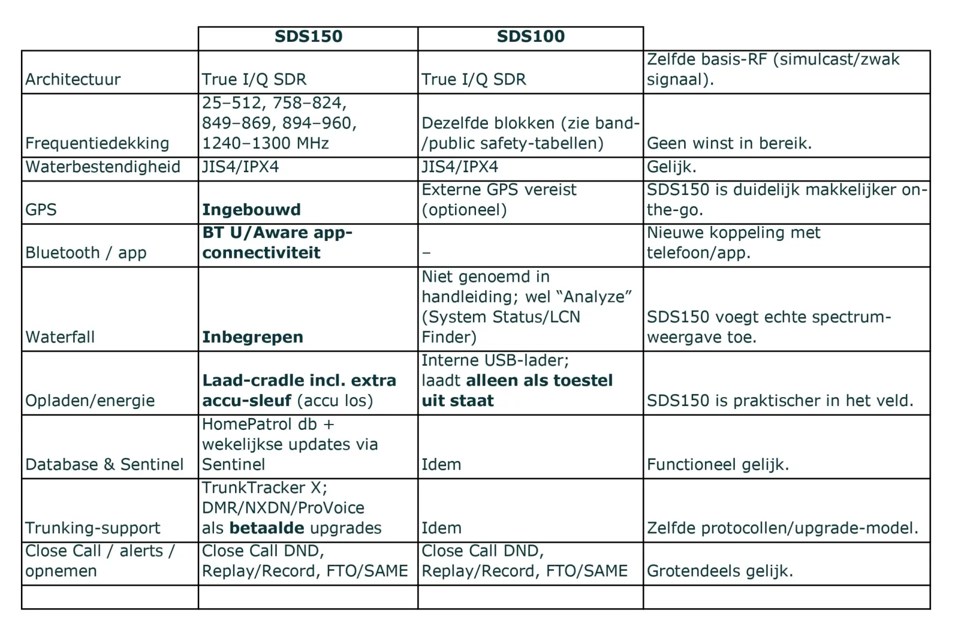 - Heb je al een SDS100 en wil je vooral betere ontvangst of meer banden? Dan levert de SDS150 waarschijnlijk geen enorm grote RF-sprong; de winst zit in workflow (GPS, waterfall, cradle, bluetooth).